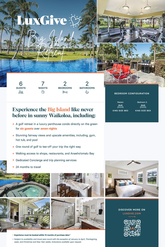 6 GUESTS 7 NIGHTS 2 BDRS 2 BATHS Experience the Big Island like never before with an unforgettable seven-night golf retreat in sunny Waikoloa. Never miss a moment of the game with stunning fairway views directly from your elegant penthouse condo. Discover Waikoloa’s premier courses and signature black lava fields with one round of golf included for six guests. VALID FOR TRAVEL WITHIN 24 MONTHS OF PURCHASE DATE. SUBJECT TO AVAILABILITY AND TRAVEL YEAR-ROUND WITH THE EXCEPTION OF JANUARY-APRIL, THANKSGIVING WEEK, AND CHRISTMAS & NEW YEAR'S WEEKS.