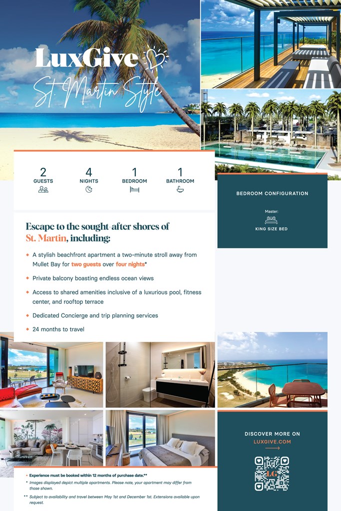 2 GUESTS 4 NIGHTS 1 BDR 1 BATH Escape to the sought-after shores of St. Martin with four nights for two guests in one of six chic beachfront apartments. Experience dreamy oceanfront living with a luxurious shared pool and private balcony boasting endless ocean views. Sink your feet into the golden sands of Mullet Bay Beach, located just a two-minute stroll away. VALID FOR TRAVEL WITHIN 24 MONTHS OF PURCHASE DATE. SUBJECT TO AVAILABILITY AND TRAVEL BETWEEN MAY 1ST AND DECEMBER 1ST.