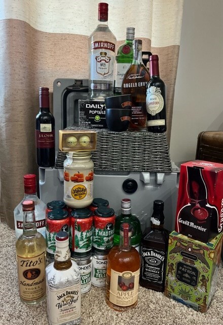 Winning bidder will receive a giant haul of adult beverages plus a Cabela cooler! The take includes: Jack Daniels Whiskey , (2) bottles of Tanqueray, (2) 6 packs of beer, Old Smokey Moonshine (pumpkin), Grand Marnier, Jack Daniels Winter Cider, Apple Brandy, (2) Smirnoff Vodka, Titos, Patron, and Angel's Envy! [ Pick up in Mason, OH 45040]